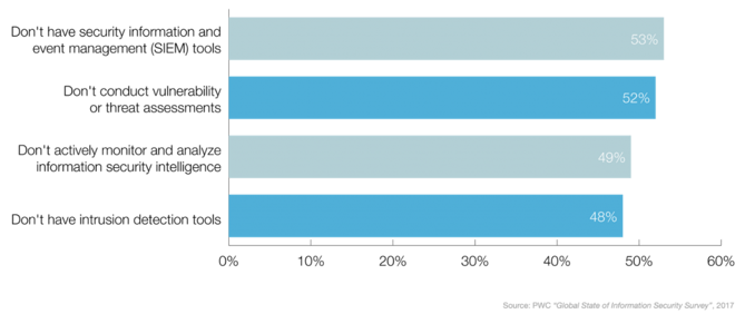 Due to the quickly evolving cybersecurity landscape, many small & medium businesses lack the ability to keep up and are ill-prepared for the threats that exist today. Below are the percentage of organizations that don’t have the following threat detection tools and processes in place.