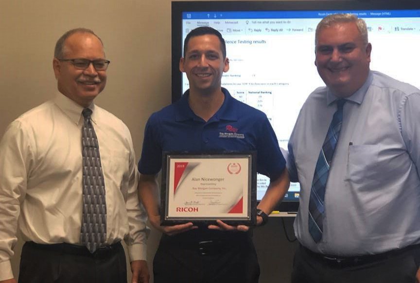 Now we come to the Circle of Excellence award from Ricoh. This is a test that takes place every spring, it is divided up in two levels, a hardware side and a software side. Technicians that are eligible can take either or both tests. Alan took both and got a 90% on the hardware side and 68.33 on the software side. To put this in perspective the National average for hardware is 65.7% and 56.2% on the software side. Alan was ranked number one at RMS in both areas. In the National rankings out of 1,778 technicians, Alan was ranked 29th in hardware and 134th in the software side. It cannot be expressed how exceptional this is, the technicians that he tested against have 10 - 20 years of experience. Alan has less than 5 years as a technician. It is an honor to have someone who did so well on my team.