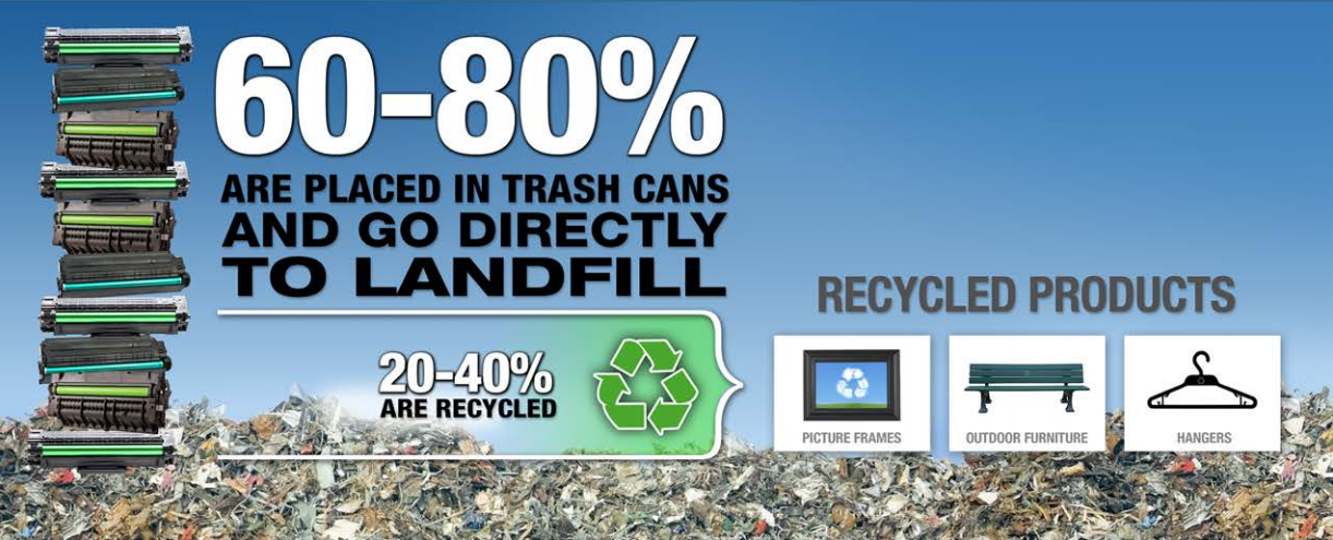 - 60 – 80 percent of used toner cartridges go directly into trash cans and end up in landfill.